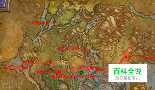 苏拉玛城位置 打开苏拉玛城周边地图后,我们可以清楚的看到几个位置,分别是深红林地、法兰纳尔等,就在深红林地的右下位置,哪里就是苏拉玛城,我们要找的暗夜要塞就在这里。