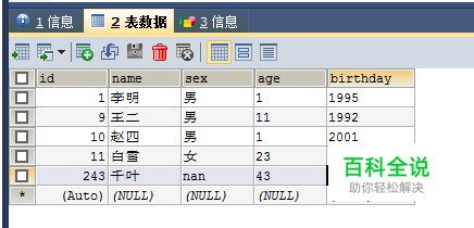 处理的表 CREATE TABLE `student` ( `id` int(50) NOT NULL AUTO_INCREMENT, `name` varchar(50) DEFAULT NULL, `sex` varchar(48) DEFAULT NULL, `age` varchar(50) DEFAULT NULL, `birthday` varchar(50) DEFAULT NULL, PRIMARY KEY (`id`)) ENGINE=InnoDB AUTO_INCREMENT=244 DEFAULT CHARSET=utf8