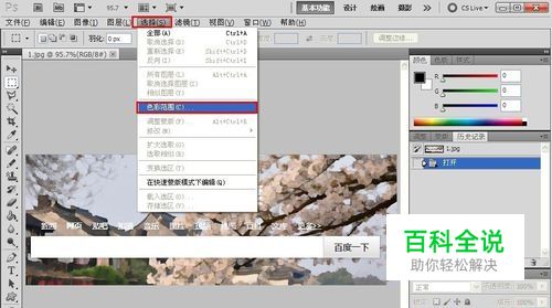 启动PS软件,打开准备好的图片。在菜单栏中单击“ 选择——色彩范围”。 如图所示: