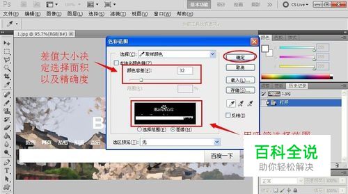 在色彩范围窗口中用吸管吸取图片中要保留部分的颜色(通过调整容差值可以决定选取的面积和精确度),单击“ 确定”。 如图所示: