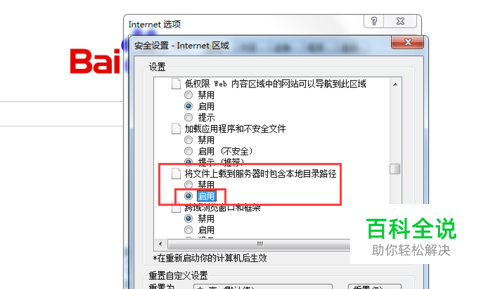 “安全设置-INTERNET区域”对话框中,往下拉,找到“二进制文件和脚本行为”选项,然后选择它下面的“启用”即可, 一般情况下默认都是启用状态的,如果是启用就不用管它,跳过看下一步。
