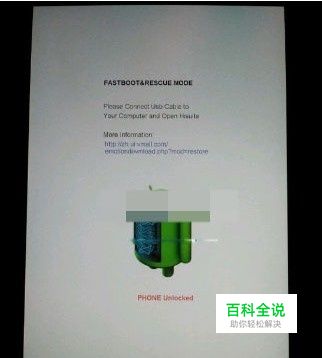 具体步骤: 手机先进行Fastboot模式:进入的方法:在手机关机状态下,按住音量减少和电源键,当屏幕中出现一只安卓机器人则已经进入FastBoot模式,如下图所示: