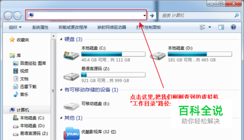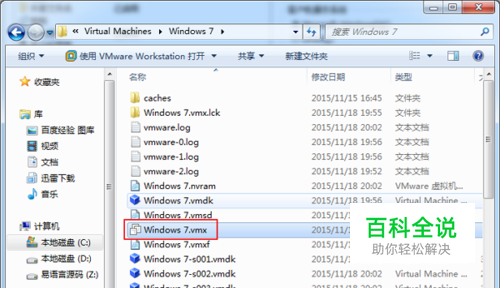 "桌面" --> 双击 "计算机" 在图中 红框内 鼠标 "单击" 后粘贴刚刚复制的 虚拟机"工作路径" --> 按键 "回车" 进入虚拟机系统存放目录! 找到 :"Windows7.vmx"(这里是我创建虚拟机保存的名称,大家直接找到后缀名为"vmx"文件) PS 后缀名 ".vmx" 是虚拟机的配置文件, 轻易不要修改!否则后果很严重 ! ! !