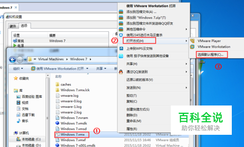 右键 "Windows7.vmx"(大家选择自己的 vmx文件) --> 点击 "打开方式(H)" --> 点击 "选择默认程序(C)..."