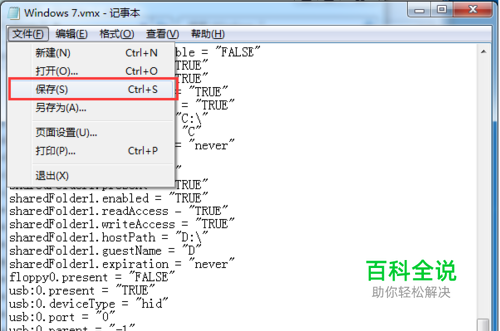 点击 "文件(F)" --> 点击 "保存" PS 虚拟机系统必须处于关机状态,否则修改vmx配置文件失效! ! !
