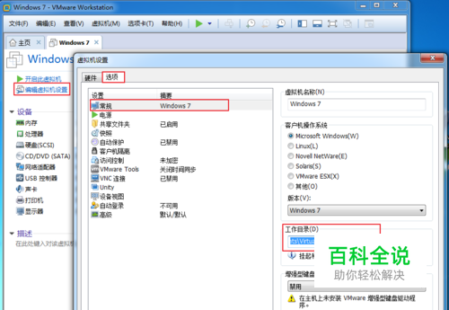 首先我们要找到当前需要玩游戏的虚拟机系统的存放目录! 点击 "编辑虚拟机设置" --> 点击 "选项" --> 点击 "常规" 右侧 "工作目录" 下面的路径全部复制下来!