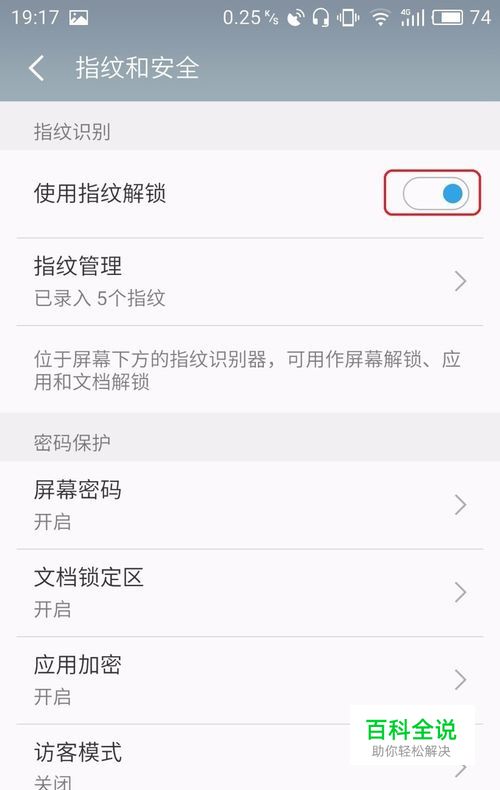 此时的“指纹解锁”按钮是开着的,点击并关闭;
