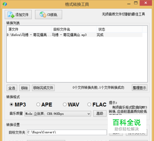 接下来在“转换格式”栏目中,选择要转换的音乐格式,如“MP3”,同时选择所转换的音乐文件输出目录,点击”转换文件“按钮即可进入音乐格式转换过程。