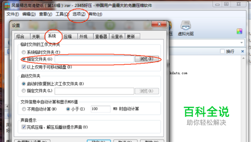 首先是解决解压时报错无法解压的问题。首先点击解压软件的选项,选择系统标签卡。
