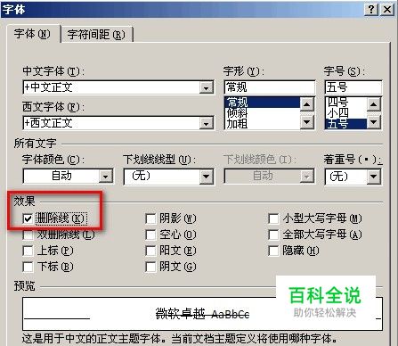 使用快捷键:Ctrl+D直接设置删除线。 a.输入文档后,选中内容,Ctrl+D,效果栏勾选:删除线,最后确定; b.先Ctrl+D,效果栏勾选:删除线,确定,然后直接输入内容; 上述两种都能出现所需效果。 (注:当不需要删除线时,选中,Ctrl+D,去除勾选即可。)