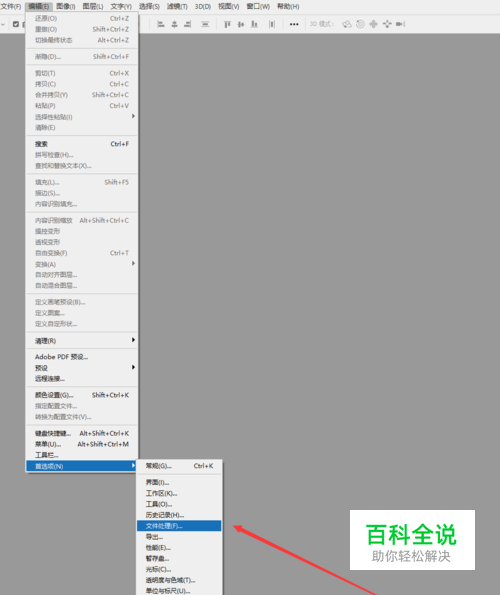 点击菜栏“编辑”>“首选项”>“常规”( Ctrl+K),打开首选项窗口,在左侧的选项中找到“文件处理”。