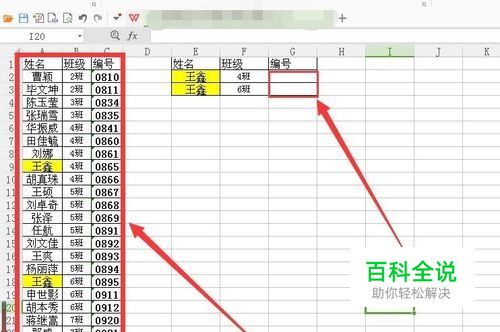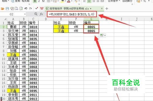 下图中左侧是姓名、班级、编号列,在右侧箭头指向的单元格中需要根据姓名及班级获取编号。