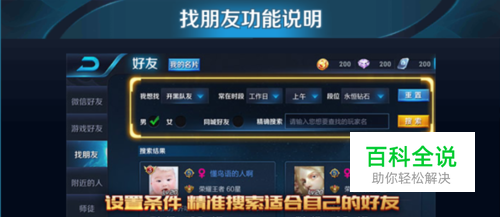 打开找好友界面后,可以在这个界面里按照条件来检索,也可以直接输入朋友游戏的名称来搜索,如下图所示。
