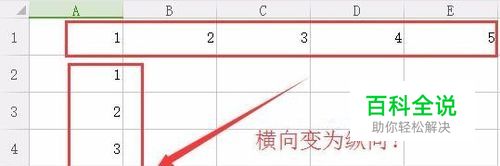 如何实现横向A1到E1的单元格转换成纵向A2到A6的形式