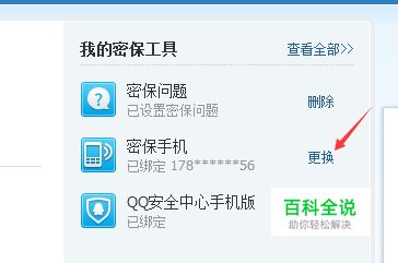 进入qq安全中心首页后,看到右侧“我的密保工具”中的“密保手机”这一选项,点击“更换”