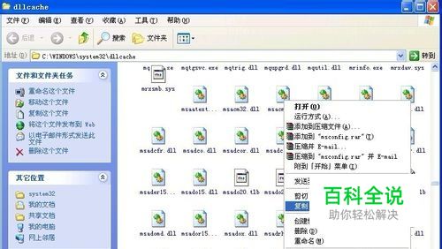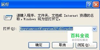 单击左下角的“开始”菜单,弹出的列表单击“运行”,在打开框中输入%systemroot%\system32\dllcache,单击“确定”。