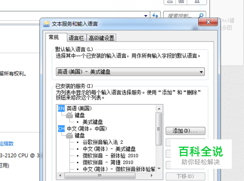 在出现的对话框中能看到在使用中的输入法。看到中文的有很多个,下面要删掉其他的,只保留一个