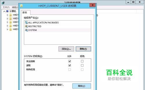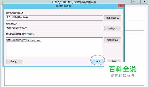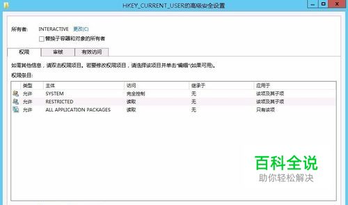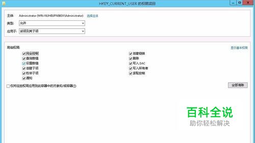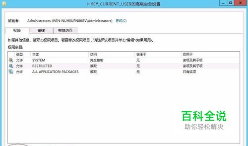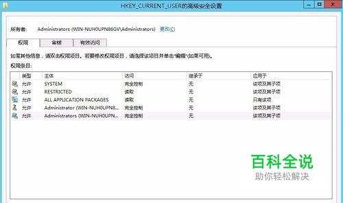 打开【HKEY_CURRENT_USER】权限对话框,查看没有机器登陆名administrator,这样是有问题的。 点击【高级】选项