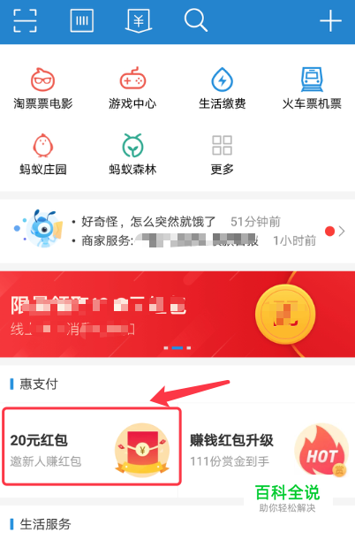打开手机支付宝,在支付宝界面中找到【惠支付】栏目中的【20元红包】,点击进入