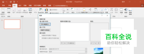 1.打开ppt,新建相册:插入——相册——新建相册。 2.弹出对话框后插入照片,在对话框中我们可以对照片进行编辑,调换图片显示位置,图片一次的显示数,添加主题等操作。如图所示。