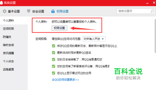 点击后弹出一个系统设置页面,在【个人资料】一栏儿中,选择【权限设置】按钮。如图,点击