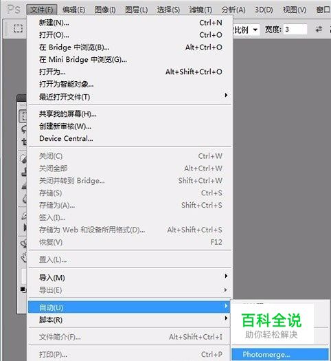 选择“文件”→,自动”→“Photomerge”,到“自动拼接”环节。