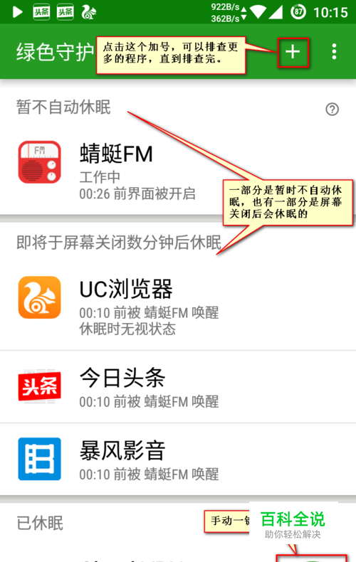 应用排查顾问。这里类似我们白名单,如果主界面里所有程序都已经休眠,但是效果还是不好,可以在这里酌情再杀掉几个,直到达到你想要的效果。