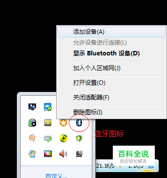 然后,在右下角的任务栏中找到蓝牙图标,点击鼠标右键,在弹出菜单中选择“添加设备”;