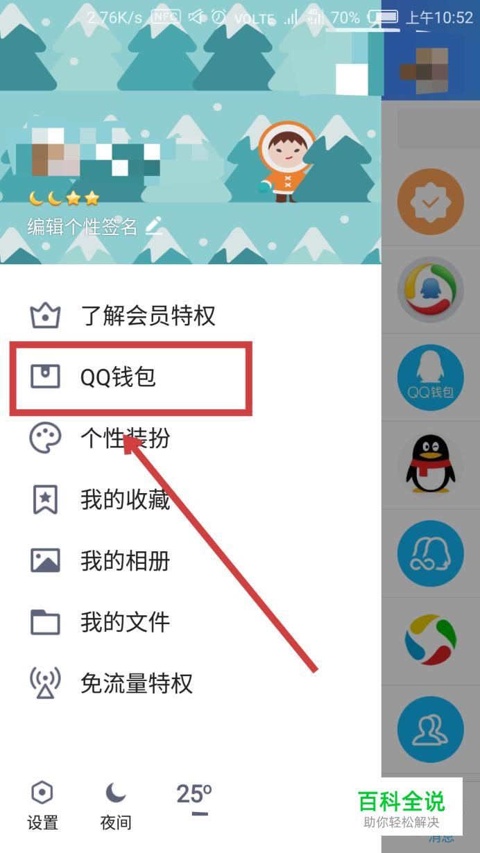 然后在左侧弹出的选项卡中找到“QQ钱包”,点击进入。