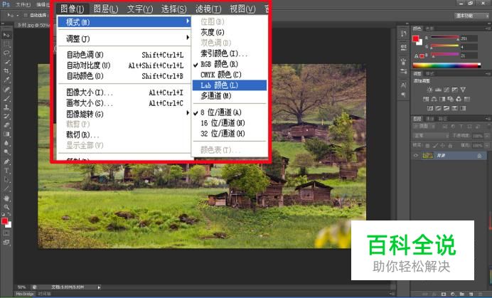 首先我们将准备转换的照片打开,然后点击菜单栏“图像-模式-Lab颜色”命令选项,将图像转换成Lab颜色模式;