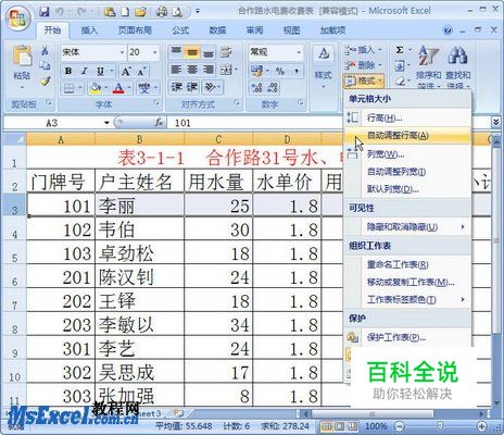 第2步,在“开始”功能区的“单元格”分组中单击“格式”按钮,在打开的菜单中选择“自动调整行高”或“自动调整列宽”命令,则Excel2007将根据单元格中的内容进行自动调整,如图2009061201所示。 图2009061201 选择“自动调整行高”或“自动调整列宽”命令