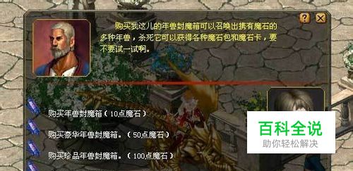 找到卡诺萨城(281,511)的如意商人·呼呼伦,他提供年兽封魔箱的发售服务。年兽封魔箱共分为五种,普通封魔箱10点魔石一个,豪华年兽封魔箱50点魔石一个,珍品年兽封魔箱100点魔石一个,极品年兽封魔箱500点魔石一个,神品年兽封魔箱1000点魔石一个。