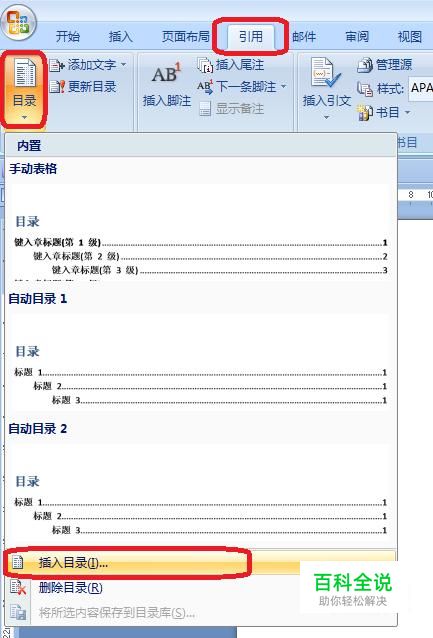 首先,我们先插入目录。打开一篇Word文档,点击标题栏“引用”,在工具栏选择“目录”,在下拉菜单中点击“插入目录”。
