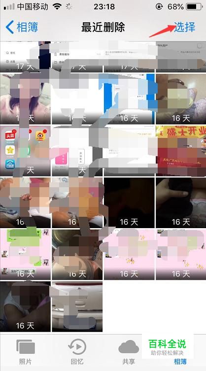 在最近删除的相册里能够看到我们删除的照片,点击右上角的选择。