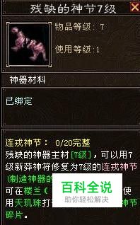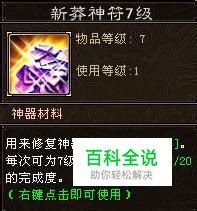 第二步:得到神符,修复残缺的神节 新莽神符得到方式一览表: 新莽神符可以修复残缺的神节,将其完整度修复为100%时,可以得到连戎神节。神符和神材分别分为6个等级,某级别的神符可以将同等级的残缺的神节修复为对应等级的连戎神节。