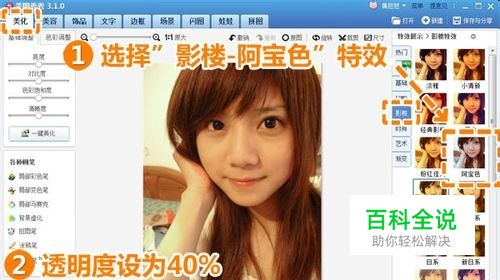在“美图秀秀”软件下打开一张色偏的人像照后,进入“美化”菜单,点击“影楼”分类下的“阿宝色”特效,并将特效透明度调为40%左右。