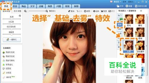 接着在“基础”分类下选择“去雾”特效,一键增强照片的对比度和色彩度,让画面更加清晰立体。