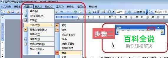 1、首先打开Word窗口,依次点击选择视图→工具栏→窗体;