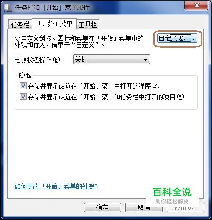 单击“「开始」菜单”选项卡,然后单击“自定义”。
