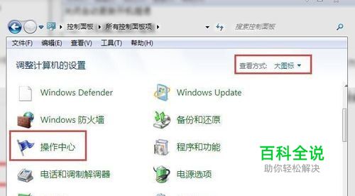 首先打开控制面板,选择“大图标”查看方式,点击“操作中心”,如图所示: