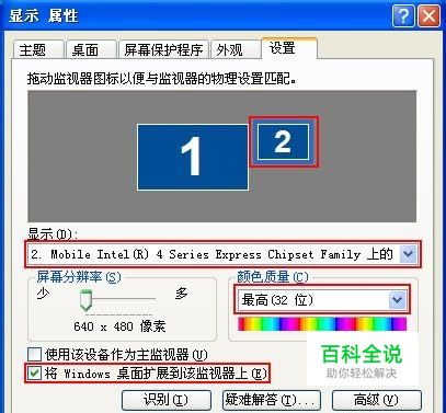 在Windows桌面上右键选择“属性”,然后在“显示属性”中选择“设置”在显示栏下选择第二屏,在将“颜色质量”选到32位,最后将“Windows桌面扩展到该监视器上”确定。