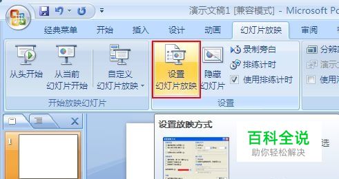 接下来启动Powerpoint2007,在“幻灯片放映”中选择“设置幻灯片放映”。