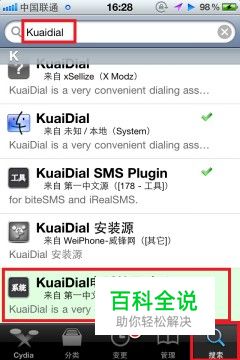 首先安装kuaidial 打开Cydia, 搜索kuaidial并安装 如图: