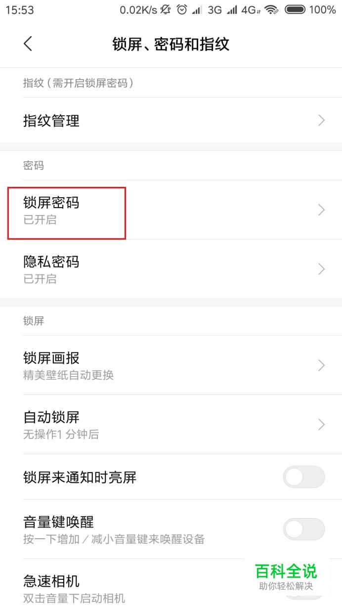 打开MIUI系统设置应用,在设置页面中,点击进入“锁屏、密码和指纹”设置项,并点击进入锁屏密码设置选项。