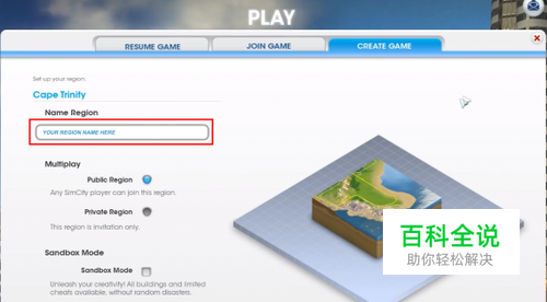 第二步,区域设置 在本页中,你可以设置你的区域名称,设置游戏是否公开和是否打开沙盒模式。公开游戏模式下,你的好友可以随意加入创建城市,私人模式下你可以选择在第四步邀请好友加入或游戏开始后再邀请。 如果你选择沙盒模式,游戏将变得更加简单(因为可以作弊啊魂淡),灾害也不会随机发生。 但是你的游戏数据将无法参与排行榜并且无法激活成就。 沙盒模式不支持多人。