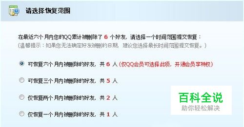 如果你想恢复QQ好友,单击相应的选项系a统就会跳和恢复范围选择,在这里普通用户最多可以恢复3个月内被删除的好友,QQ会员最多可以恢复6个月内被删除的好友。