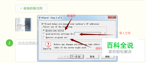 设置页面: 第一项,增加新的IP 第二项,使用文件导入IP 第三项,释放已经设置的IP 设置好后点击下一步