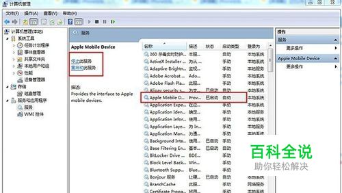 况二: 你也可以打开iTunes查看手机是否可以正常识别显示,如果在电脑接入手机后没有连接提示,查看进程或服务中的Apple Mobile Device服务是否在运行。具体操作步骤:点击桌面上【计算机】鼠标右键【管理】,然后点击【服务和应用程序】中的【服务】,找到Apple Mobile Device直接开启运行即可。如果打开后显示已经启动的状态,建议按照下图所示点击【停止】,重新启动一次。