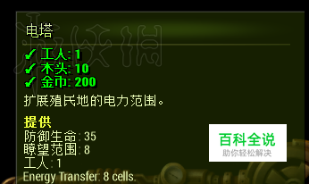 电塔:这游戏的建筑必须建在电塔范围内,不然建不了,是你扩展地图的基础。注意,只要电塔被打坏,范围内的建筑都会停止运行,所以,别让你的电塔太靠外