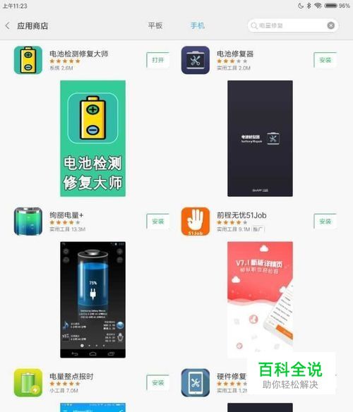 打开小米平板自带的应用商店,搜索电量修复,选择排在第一个的电池检测修复大师进行安装